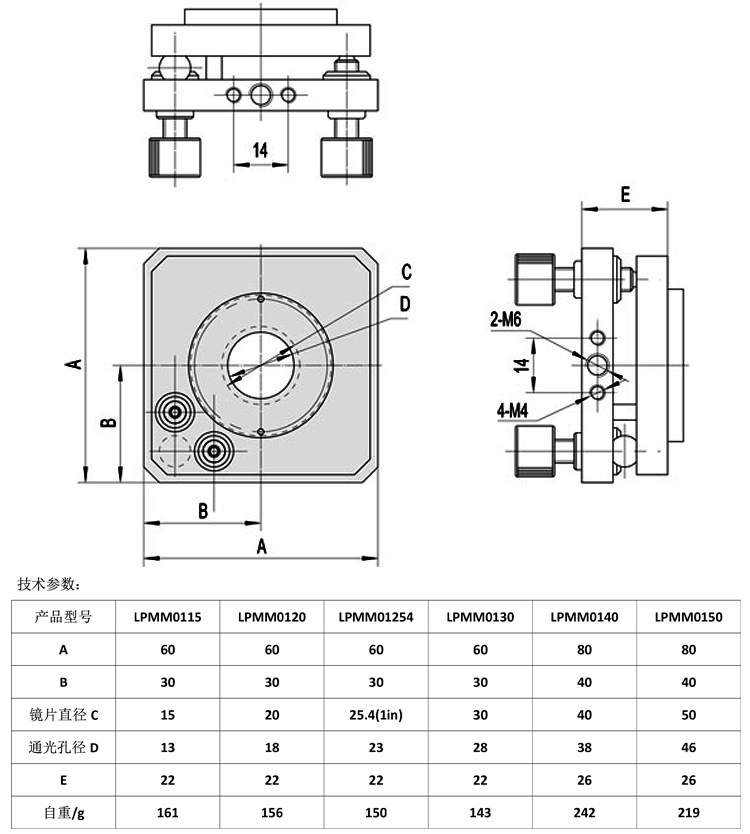 產(chǎn)品詳情 LPMM01系列兩維調(diào)整鏡架 實(shí)驗(yàn)設(shè)備透鏡鏡片固定安裝 在線咨詢 產(chǎn)品詳情 ● M6×0.25細(xì)牙螺桿調(diào)整(配銅螺母) ● 碟形彈簧復(fù)位,復(fù)位力可調(diào),從零到剛性,調(diào)整范圍±3° ● 鏡筒裝卡鏡片,可以裝好鏡片后再固定到調(diào)整架上 ● 聚四氟乙烯墊片,保護(hù)鏡片 ● 兩個(gè)方向安裝孔,適合不同光路方向 調(diào)整鏡架可將鏡片進(jìn)行兩維傾斜或多維固定調(diào)整。調(diào)整螺桿采用M6×0.25細(xì)牙 螺桿,提供精細(xì)調(diào)整。根據(jù)不同的鏡片裝卡方式,不同的裝卡直徑,不同的調(diào) 整螺桿,不同的彈性復(fù)位方式分出近百種規(guī)格,廣泛應(yīng)用于與光學(xué)相關(guān)的科研, 教學(xué),工業(yè)產(chǎn)品特別是激光打標(biāo),激光焊接,激光雕刻,激光劃片等激光加工 設(shè)備上。