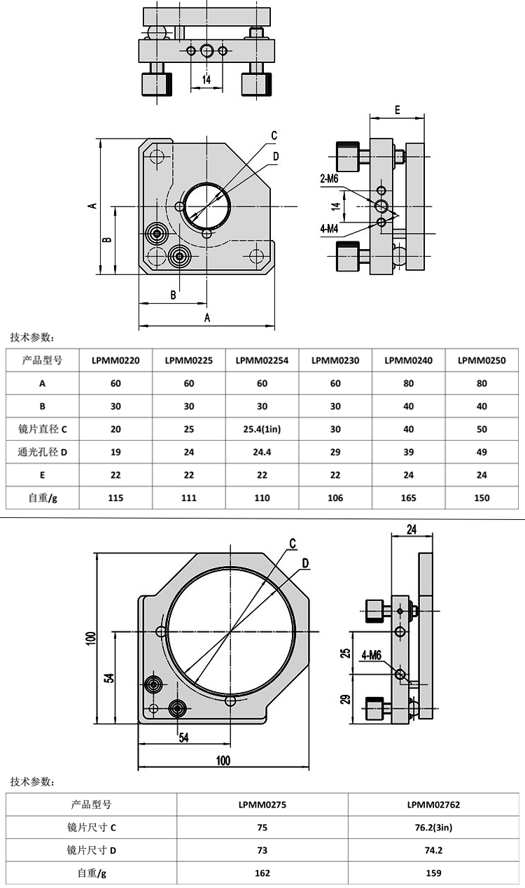 產(chǎn)品詳情 LPMM02系列兩維調(diào)整鏡架 實(shí)驗(yàn)設(shè)備透鏡鏡片固定安裝 在線咨詢 產(chǎn)品詳情 ● M6×0.25細(xì)牙螺桿調(diào)整(配銅螺母) ● 碟形彈簧復(fù)位,復(fù)位力可調(diào),從零到剛性 ● 調(diào)整范圍±3° ● 三點(diǎn)聚四氟乙烯支撐,保護(hù)鏡片 ● 兩個(gè)方向安裝孔,適合不同光路方向 調(diào)整鏡架可將鏡片進(jìn)行兩維傾斜或多維固定調(diào)整。調(diào)整螺桿采用M6×0.25細(xì)牙 螺桿,提供精細(xì)調(diào)整。根據(jù)不同的鏡片裝卡方式,不同的裝卡直徑,不同的調(diào) 整螺桿,不同的彈性復(fù)位方式分出近百種規(guī)格,廣泛應(yīng)用于與光學(xué)相關(guān)的科研, 教學(xué),工業(yè)產(chǎn)品特別是激光打標(biāo),激光焊接,激光雕刻,激光劃片等激光加工 設(shè)備上。