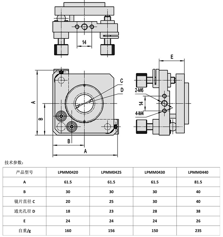 產(chǎn)品詳情 LPMM04系列兩維調(diào)整鏡架 實(shí)驗(yàn)設(shè)備透鏡鏡片固定安裝 在線咨詢 產(chǎn)品詳情 ● M6×0.25細(xì)牙螺桿調(diào)整,特殊銅螺母,可以軸向鎖緊螺桿,防止震動(dòng)松動(dòng) ● 碟形彈簧復(fù)位,復(fù)位力可調(diào),從零到剛性,調(diào)整范圍±3° ● 可在鏡筒上裝好鏡片再固定到鏡架上 ● 聚四氟乙烯墊片,保護(hù)鏡片 ● 兩個(gè)方向安裝孔,適合不同光路方向 調(diào)整鏡架可將鏡片進(jìn)行兩維傾斜或多維固定調(diào)整。調(diào)整螺桿采用M6×0.25細(xì)牙 螺桿,提供精細(xì)調(diào)整。根據(jù)不同的鏡片裝卡方式,不同的裝卡直徑,不同的調(diào) 整螺桿,不同的彈性復(fù)位方式分出近百種規(guī)格,廣泛應(yīng)用于與光學(xué)相關(guān)的科研, 教學(xué),工業(yè)產(chǎn)品特別是激光打標(biāo),激光焊接,激光雕刻,激光劃片等激光加工 設(shè)備上。