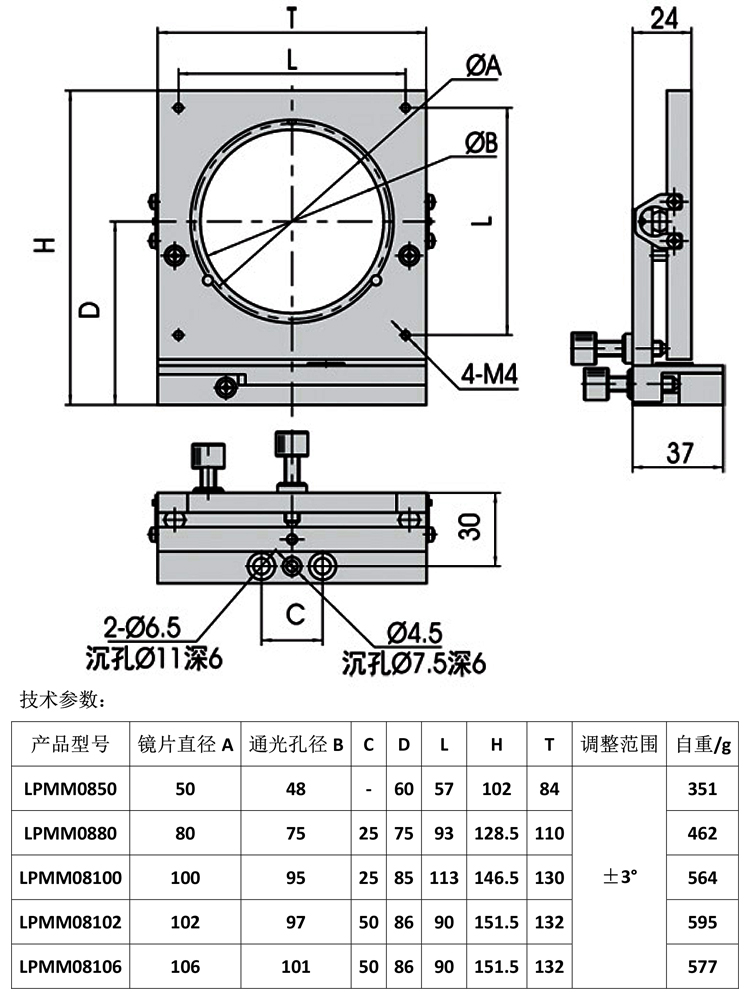 產(chǎn)品詳情 LPMM08系列兩維調(diào)整鏡架 實(shí)驗(yàn)設(shè)備透鏡鏡片固定安裝 在線咨詢 產(chǎn)品詳情 ● 可將鏡片兩維正交共面調(diào)整,光程不變 ● M6×0.25細(xì)牙螺桿調(diào)整(配銅螺母) ● 碟形彈簧復(fù)位,復(fù)位力可調(diào),從零到剛性 ● 配套LPMB13底板安裝,調(diào)整范圍±3° ● 聚四氟乙烯三點(diǎn)剛性支撐鏡片 調(diào)整鏡架可將鏡片進(jìn)行兩維傾斜或多維固定調(diào)整。調(diào)整螺桿采用M6×0.25細(xì)牙 螺桿,提供精細(xì)調(diào)整。根據(jù)不同的鏡片裝卡方式,不同的裝卡直徑,不同的調(diào) 整螺桿,不同的彈性復(fù)位方式分出近百種規(guī)格,廣泛應(yīng)用于與光學(xué)相關(guān)的科研, 教學(xué),工業(yè)產(chǎn)品特別是激光打標(biāo),激光焊接,激光雕刻,激光劃片等激光加工 設(shè)備上。