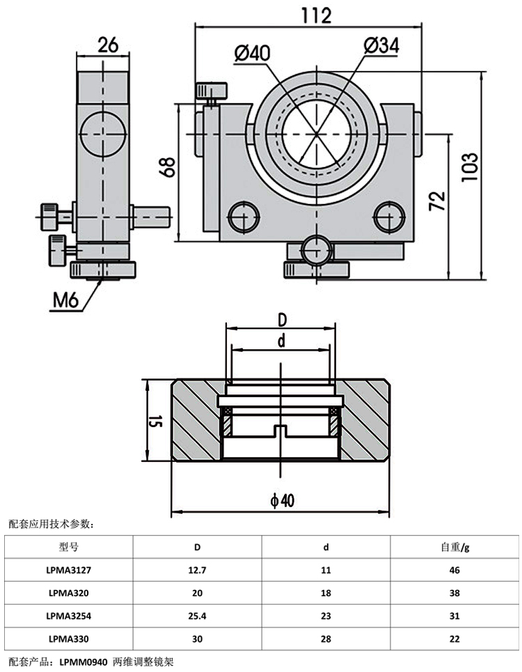 產(chǎn)品詳情 LPMM0940兩維調(diào)整鏡架 實驗設(shè)備透鏡鏡片固定安裝 在線咨詢 產(chǎn)品詳情 ● 兩旋轉(zhuǎn)軸正交共面,所以可將鏡片兩維正交共面調(diào)整,保證光程不變 ● M6×0.25細(xì)牙螺桿調(diào)整(配銅螺母) ● 可360°粗調(diào),±3°微調(diào) ● 可裝卡40mm直徑鏡片 ● 配套產(chǎn)品LPMA3變徑圈組合使用 調(diào)整鏡架可將鏡片進(jìn)行兩維傾斜或多維固定調(diào)整。調(diào)整螺桿采用M6×0.25細(xì)牙 螺桿,提供精細(xì)調(diào)整。根據(jù)不同的鏡片裝卡方式,不同的裝卡直徑,不同的調(diào) 整螺桿,不同的彈性復(fù)位方式分出近百種規(guī)格,廣泛應(yīng)用于與光學(xué)相關(guān)的科研, 教學(xué),工業(yè)產(chǎn)品特別是激光打標(biāo),激光焊接,激光雕刻,激光劃片等激光加工 設(shè)備上。
