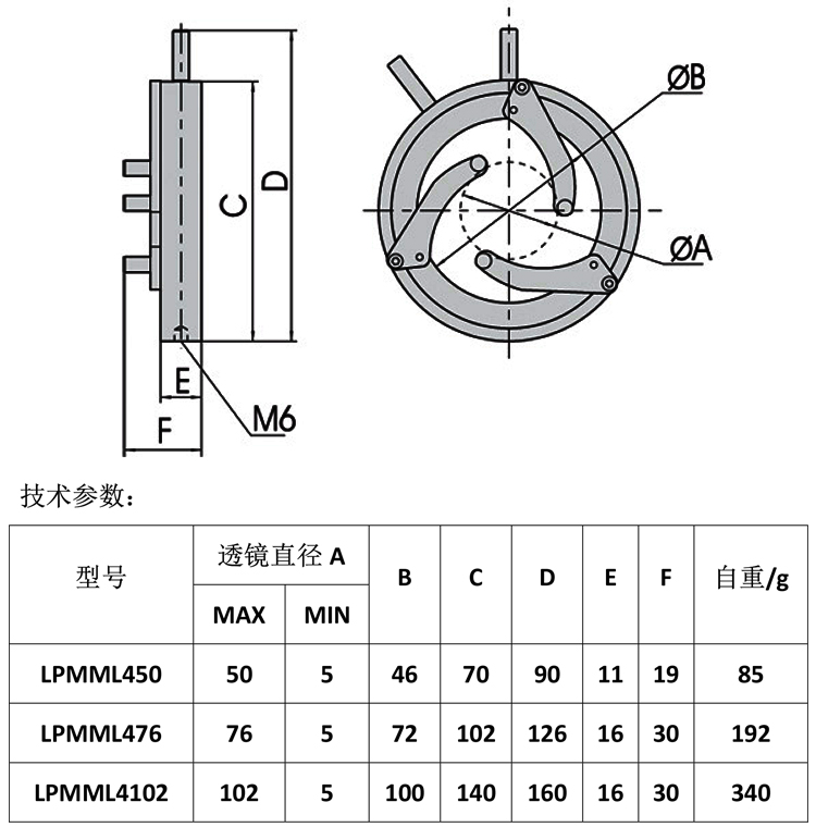 產(chǎn)品詳情 LPMML4系列自定心透鏡架 光學(xué)實驗鏡片安裝座自定心透鏡支架 在線咨詢 產(chǎn)品詳情 ● 三個支撐臂同時連續(xù)開啟 ● 適用不同直徑的透鏡 ● 更換透鏡時,透鏡中心不變 ● 彈簧自動復(fù)位,適用較輕重量的透鏡 ● 最小夾持5,最大夾持102 自定心透鏡架可以夾持多種鏡片或圓柱體,適應(yīng)性強,裝卸方便,夾持牢固。鏡 架根據(jù)不同的鏡片裝卡方式,不同的裝卡直徑,不同的調(diào)整螺桿,不同的彈性復(fù) 位方式分出近百種規(guī)格,廣泛應(yīng)用于與光學(xué)相關(guān)的科研,教學(xué),工業(yè)產(chǎn)品特別是 激光打標(biāo),激光焊接,激光雕刻,激光劃片等激光加工設(shè)備上。