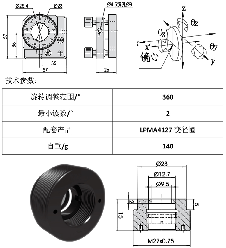 產(chǎn)品詳情 LPMMP2254系列光學(xué)偏光調(diào)整鏡架 光學(xué)實(shí)驗(yàn)鏡片安裝座旋轉(zhuǎn)透鏡支架 在線咨詢 產(chǎn)品詳情 ● M6×0.25細(xì)牙螺桿調(diào)整,碟形彈簧復(fù)位,彈性可調(diào),直至剛性 ● 可裝卡25.4mm(1in)的偏光鏡片,壓圈鎖緊 ● 采用精密軸系旋轉(zhuǎn)調(diào)整,定位穩(wěn)定可靠 ● 周圈360°刻劃,最小讀數(shù)2°兩維傾斜調(diào)整范圍±3° 偏光鏡架可將鏡片進(jìn)行兩維傾斜或多維固定調(diào)整。調(diào)整螺桿采用細(xì)牙螺桿,鎖 緊手輪等固定方式,提供精細(xì)調(diào)整。根據(jù)不同的鏡片裝卡方式,不同的裝卡直 徑,不同的調(diào)整螺桿,不同的彈性復(fù)位方式分出近百種規(guī)格,廣泛應(yīng)用于與光 學(xué)相關(guān)的科研,教學(xué),工業(yè)產(chǎn)品特別是激光打標(biāo),激光焊接,激光雕刻,激光 劃片等激光加工設(shè)備上。