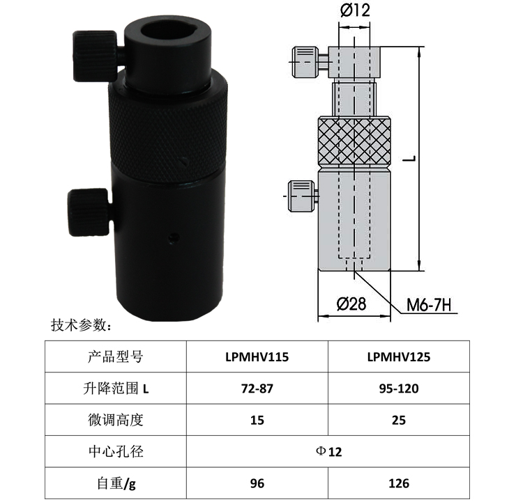 產品詳情 LPMHV1系列升降支撐桿架(可配套直徑12支撐桿) 應用于實驗設備升降固定轉接與光學平臺連接 在線咨詢 產品詳情 ● 中心12mm圓孔,可將LPMP系列支撐桿固定在不同高度 ● 調整支撐桿高度而支撐桿的角相位不變 ● 升降螺紋微調高度,支撐桿和升降部均可可靠鎖緊 ● 底部M6螺紋孔方便與其它光具座連接 萊普科技桿架可用于光學光具類產品的固定與連接,滿足試驗當中對不同需求, 配合LPMP系列支撐桿組合使用,以達到光學實驗中需要的不同高度。桿架有2 種規(guī)格,均配有鎖緊固定手鈕,底部帶有與平臺光具座連接的M6螺紋孔,桿架 包括鎖緊固定、升降微調、手動旋轉等多種功能。桿架是光學實驗、科研研發(fā)、 加工生產中廣泛應用的支撐轉接器材。